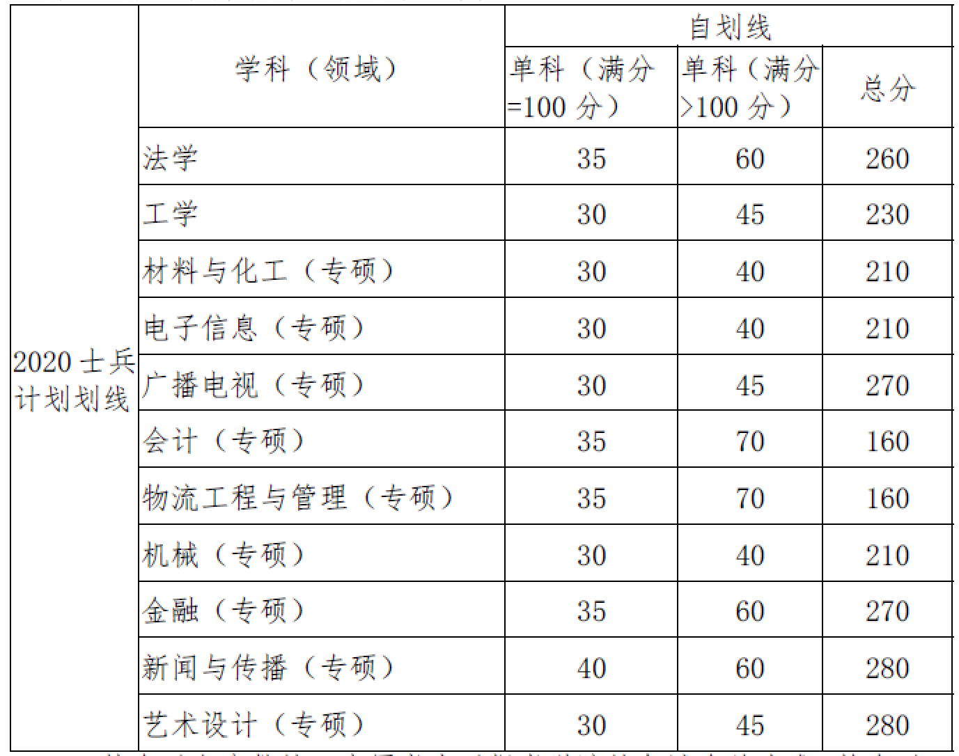 (3)报考“退役大学生士兵”专项硕士研究生招生计划的考生,需达到以下成绩要求,方能参加复试。