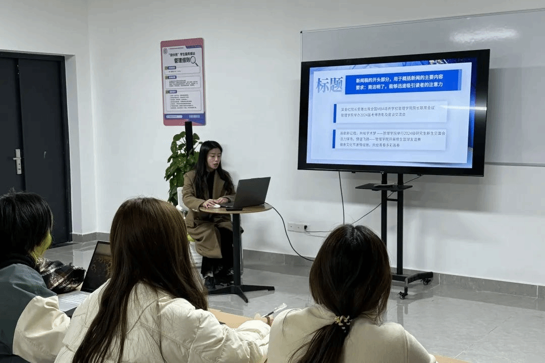 在培训过程中,文宣部的何珍珍就新闻稿撰写规范技巧进行了深入讲解,为我们揭开了新闻稿的神秘面纱。她不仅详细阐述了新闻稿的结构和要素,还特别强调了配图拍摄需要找好角度,突出人物形象,指出一张好的图片能够使新闻稿更加生动和吸引人。她的分享让每位干事都对新闻稿有了全新的认识和理解。
