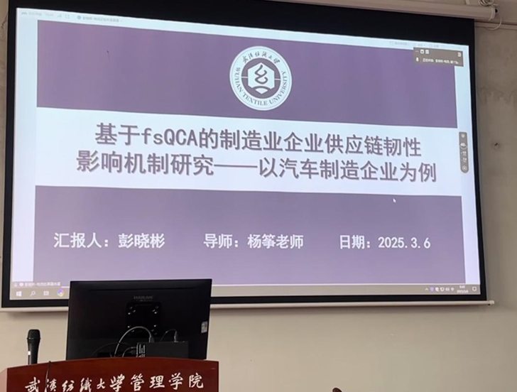 随后,彭晓彬同学也通过网络分享了她的论文《基于fsQCA的制造业企业供应链韧性影响机制研究——以汽车制造企业为例》。她运用模糊集定性比较分析(fsQCA)方法,探讨了汽车制造企业供应链韧性的关键影响因素及其作用机制。周正龙老师对彭晓彬的研究方法表示肯定,并建议她进一步拓展样本范围,以提升研究的普适性。
