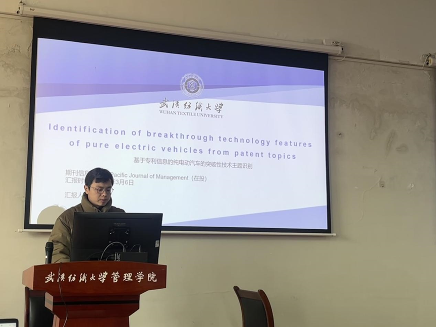 最后,裴文同学汇报了他的论文《基于专利信息的纯电动汽车突破性技术主题识别》。他通过专利数据分析,识别了纯电动汽车领域的关键技术主题,并提出了未来技术发展的趋势预测。王雪老师和周正龙老师一致认为,裴文的研究具有较强的创新性,同时建议他在技术主题的分类上进一步细化,以增强研究的深度。