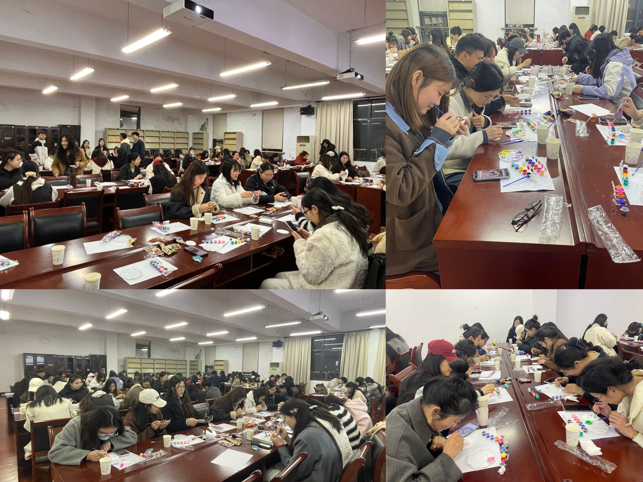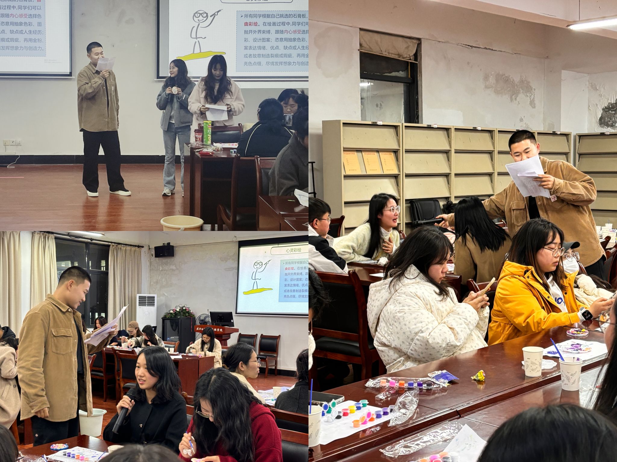 活动伊始,主持人以“心灵手巧,妙笔生花”为引,用充满激情与活力的开场白,正式拉开了这场艺术与心灵之旅的帷幕。团支部的干事们提前数日精心筹备,为参与者们准备了各式各样、形状各异的石膏板,以及丰富多样的颜料和绘画工具。他们还用心布置了温馨舒适的创作环境,让每一位踏入现场的同学都能感受到温暖与放松,仿佛置身于一个充满创意与自由的艺术空间。