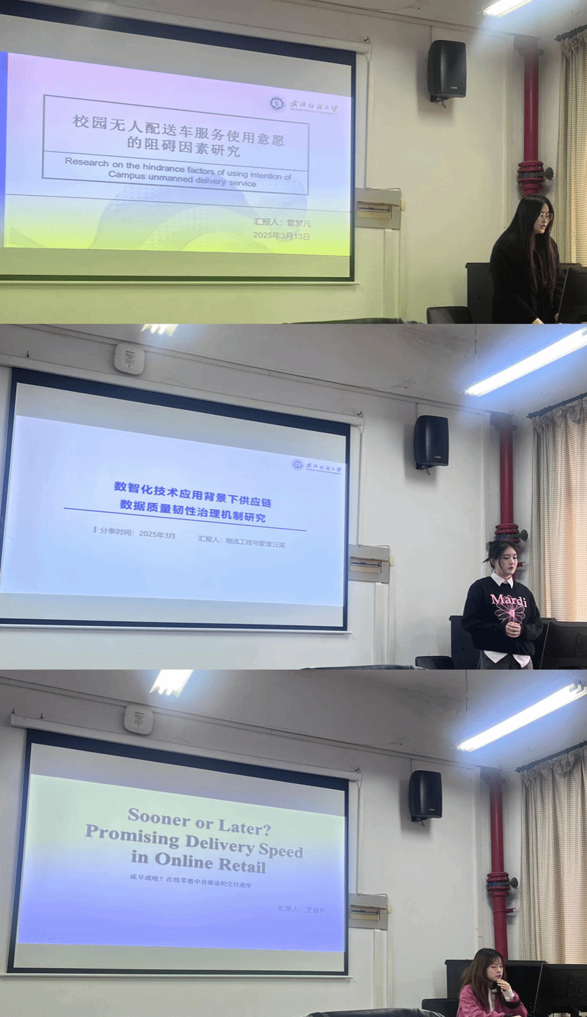 管梦凡同学首先以《校园无人配送车服务使用意愿的阻碍因素研究》为题,通过实证分析揭示了学生对无人配送车接受度的主要障碍,并提出优化服务界面与隐私保护机制的建议。汪瑶同学随后分享了《数智化技术应用背景下供应链数据质量韧性治理机制研究》,她构建了“技术-管理-生态”三维治理框架,强调区块链与人工智能协同提升数据可靠性的路径。