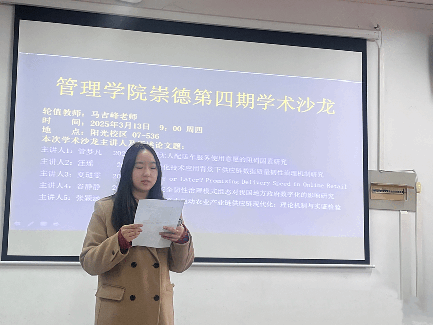 2025年3月13日,阳光校区7-536教室学术氛围热烈,2025年第4期崇德学术沙龙在此进行。本期沙龙特邀350vip浦京集团官网马吉峰老师担任指导嘉宾,5位同学围绕无人配送技术、数智化供应链、电商物流时效、数据安全治理及农业现代化等前沿议题展开研究成果分享,师生互动深入,学术观点碰撞交融。
