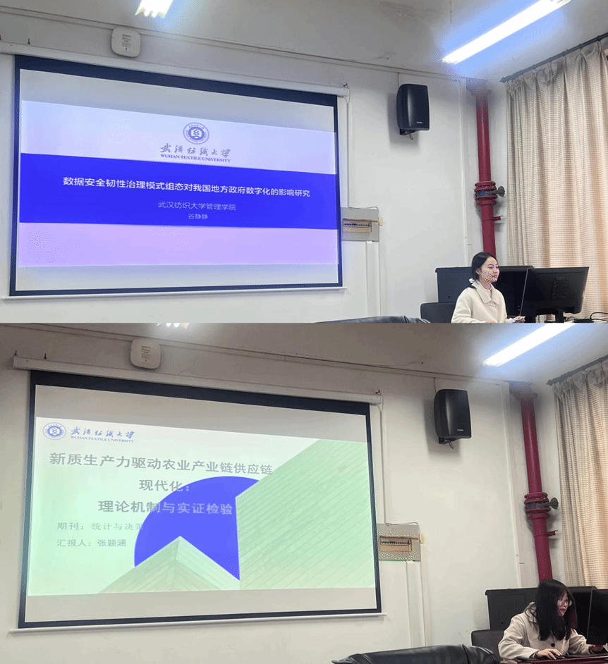 谷静静同学聚焦《数据安全初性治理模式组态对我国地方政府数字化的影响研究》,运用QCA方法解析了不同治理模式组合对数字化进程的驱动效应。王吉峰老师点评称,该研究为政策制定提供了新思路,同时提议纳入跨区域数据治理冲突案例,以深化对复杂治理场景的解释力。张颖涵同学汇报了《新质生产力驱动农业产业链供应链现代化:理论机制与实证检验》,从智能装备应用、绿色技术渗透与组织模式创新三方面论证农业供应链升级路径。马吉峰老师高度评价其跨学科视角,并建议结合乡村振兴典型案例,剖析区域资源禀赋差异对技术适配性的影响。