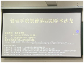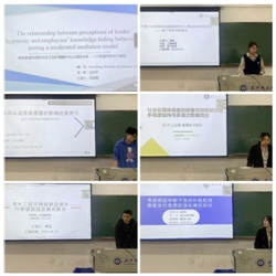 在会场一中,首先分享的是来自20级的田淑慧同学,介绍了《The Relationship Between Perceptions of Leader Hypocrisy and Employees’Knowledge Hiding Behaviors: Testing a Moderated Mediation Model》的相关内容,知识共享对当今组织的生存和发展至关重要,但员工并不总是愿意分享他们的知识,有时甚至有意或无意地隐藏知识。论文从领导视角出发,旨在探讨领导虚伪对员工知识隐藏行为的影响。随后是来自20级物流的方彬同学,论述了题为《生鲜商品退货意愿影响因素研究》,在网络购物退货率高达30%的背景下,提高了生鲜商家的成本,阻碍了行业发展,论文利用评论数据挖掘技术,对消费者在生鲜销售平台上的评论进行情感分析及评论属性-观点词提取,来研究影响生鲜商品消费者产生退货意愿的潜在因素。然后是来自20级物流的黄迅同学,他介绍了论文《调水工程可持续供应链协同管理成因及模式分析》,论文在基于可持续供应链和协同管理视角,从“战略-管理-操作”三个维度构建调水工程可持续供应链的协同管理模型,并以南水北调中线工程水量调度为例,构建协同管理平台,提出水量调度约束条件和模型效益计算公式。第四位分享者是来自21级工商管理的张意同学,在他的论文《后疫情时期公众新冠肺炎威胁感知对心理焦虑的影响机制——基于保护动机理论》中研究拟通过保护动机理论构建一个公众新冠肺炎威胁感知影响心理焦虑的理论模型,从理论层面剖析公众新冠焦虑形成的内在机制,从而有助于政府以更有效的方法来实施重大突发公共卫生事件的管理并兼顾公众的心理健康。第五位是来自21级物流的关诗林同学,论述题目为《社会化媒体赋能的顾客共创体验价值:多维度结构与多层次影响》,论文立足于社会化媒体情境界定顾客共创体验价值的内涵与维度、开发全面而科学的测量量表,并验证量表信效度及其多层次影响效应。最后一位是21级物流的郝玲珂同学,题目为《考虑供应中断下政府补贴和消费者支付意愿的演化博弈研究》,论文试图将政府补贴和供应中断结合起来,可以促进社会资源的优化配置、调整生产结构,为中断背景下加快经济发展提供更广阔的思路。