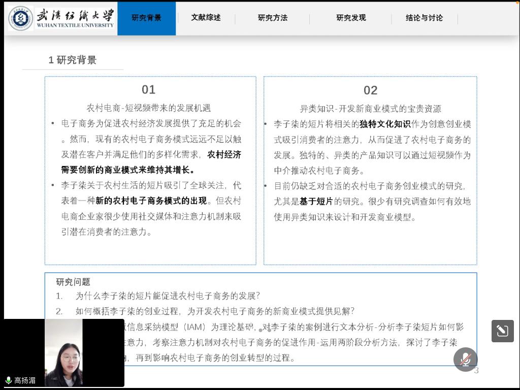 高扬湄同学介绍了论文《基于注意力机制的农村电子商务模式:从异类知识管理的角度看李子柒短视频的作用》,电子商务为促进农村经济发展提供了充足的机会。然而,现有的农村电子商务模式远远不足以触及潜在客户并满足他们的多样化需求。为了充分利用电子商务的优势,农村经济需要创新的商业模式来维持其增长。一些农村互联网名人,如中国的李子柒,已经认识到短视频的价值,并将其作为创意创业模式,向农村地区的客户推广和销售其产品。本文基于信息采纳模型和注意机制,运用逆向工程方法研究和概括了李子柒在农村电子商务中的创业过程。我们发现,李子柒的短片通过相关的独特文化知识吸引消费者的注意力,从而促进了农村电子商务的发展。独特的、异质的产品知识可以通过短视频作为中介推动农村电子商务。短视频的关注机制有助于发展受商业影响驱动的农村电子商务新商业模式。我们的研究为农村电子商务企业家推广其产品提供了宝贵的见解。