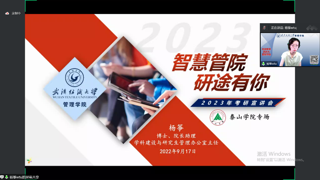 2022年9月17日,350vip浦京集团官网杨筝博士为泰山学院举办了线上考研宣讲,考研上岸的优秀研究生徐瑞杰,李继华也作了心得分享。
