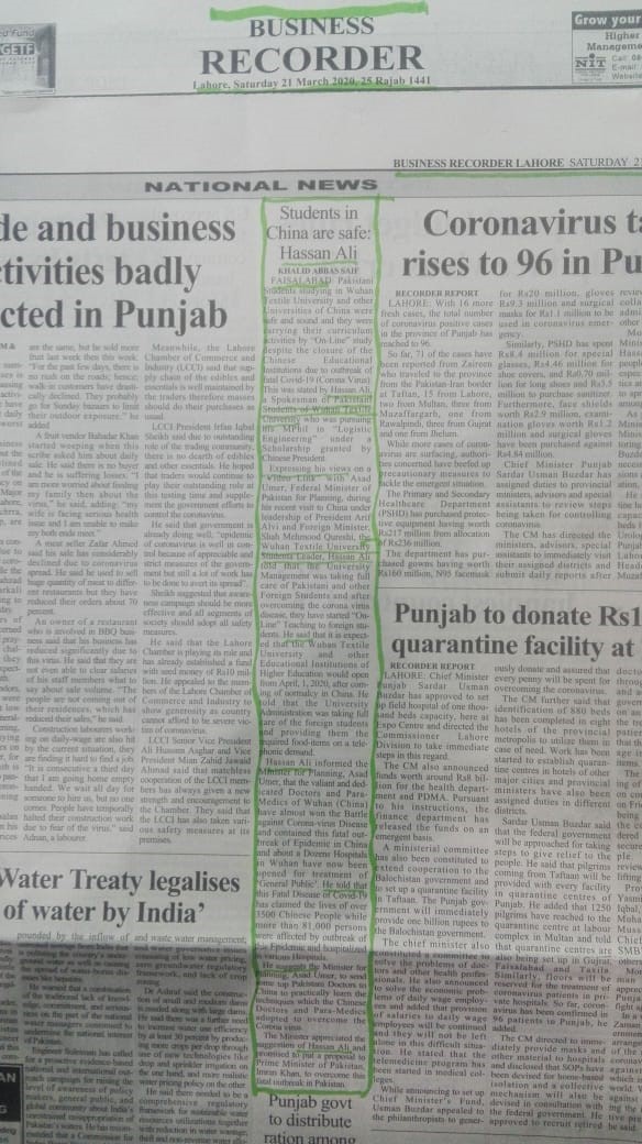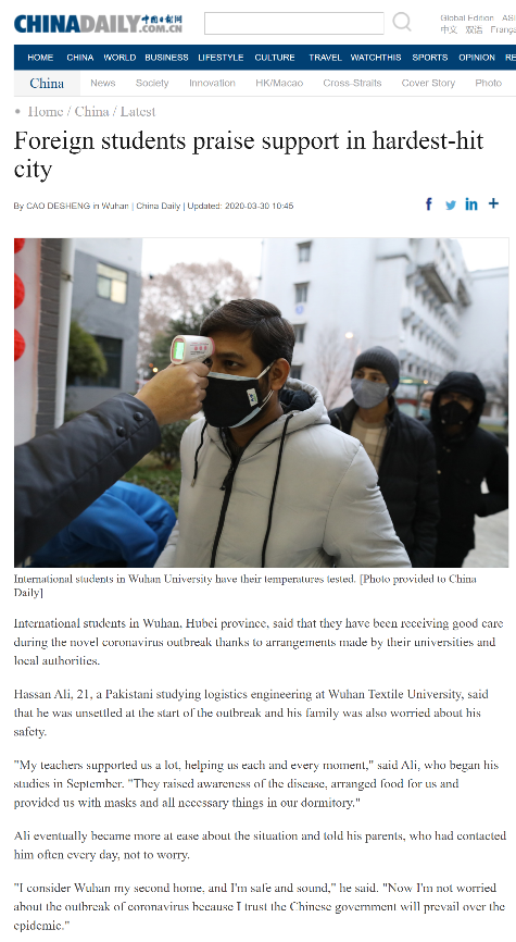 2020年,武汉新冠疫情暴发以来,350vip浦京集团官网2019级物流工程与管理专业留学生哈森·阿里(Hassan Ali)一直坚守在武汉,并没有撤离回到巴基斯坦,见证了武汉疫情从暴发到被控制的全过程,亲历了疫情期间中国政府的防控举措。在此过程中,哈森·阿里一直相信中国政府,密切配合学校做好防控工作,并积极向巴基斯坦报社投稿,宣传中国的疫情防控措施,还通过视频连线向巴基斯坦计划发展和改革部长阿萨德·奥马尔汇报武汉巴基斯坦留学生的生活和健康状况。哈森·阿里接受了巴基斯坦三家报纸的采访,和China daily英文版驻汉记者的采访。
